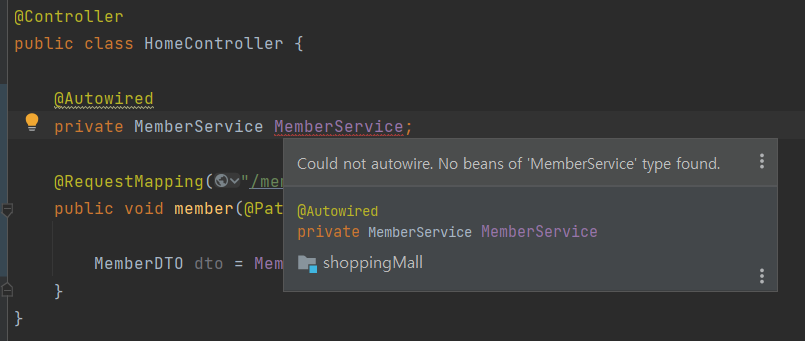 Controller 작성 중 @Autowired Annotation을 통한 Dependency Injection 과정 중 MemberService type의 Bean을 찾을 수 없다는 오류 발생
